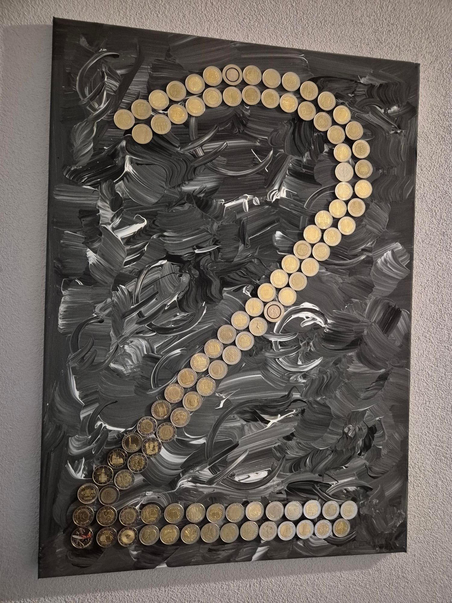 Und dann sind da noch die Münzen. Ich bezeichne mich als Hobby-Numismatiker. Die gesammelten Stücke verschwinden regelmäßig in irgendwelchen Alben und interessieren keinen außer mich. Nun habe ich einige 2-Euro-Münzen befreit und stelle sie als Collage bei uns im Flur aus.